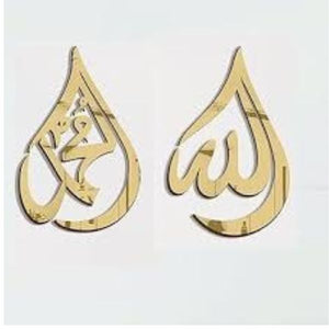 Transform your home with the Allah SWT Muhammad PBUH Wall Art - Drop Design from GiftStudio.shop. This captivating Islamic wall art showcases a unique drop-shaped silhouette featuring the sacred names of Allah (SWT) and Muhammad (PBUH) in elegant calligraphy. Crafted from 6mm MDF wood with a glossy 1.2mm gold or silver acrylic coating, it’s available in three sizes: 8x12" (M), 12x18" (L), or 20x30" (XL). Ideal as Ramadan decor or an Eid Mubarak gift, this piece blends traditional faith with modern style, perfect for homes in Lahore, Karachi, and Islamabad.